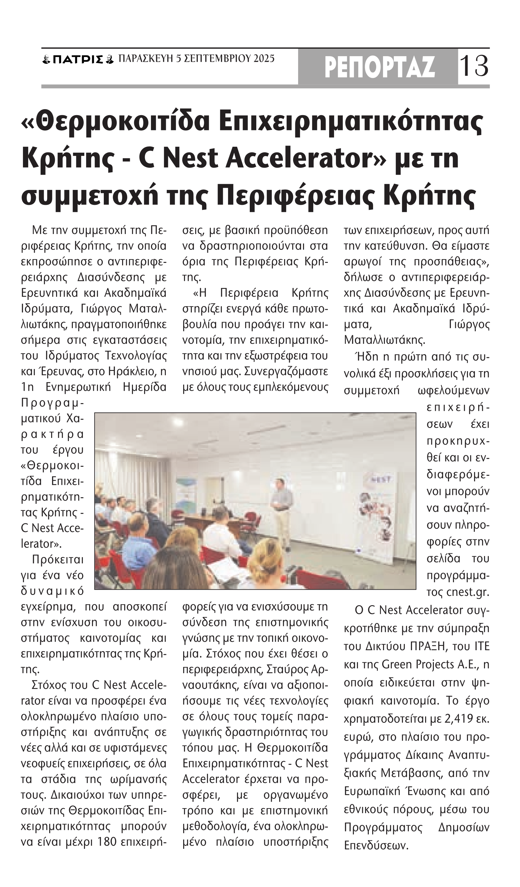 Με την συμμετοχή της Περιφέρειας Κρήτης, την οποία εκπροσώπησε ο Αντιπεριφερειάρχης Διασύνδεσης με Ερευνητικά και Ακαδημαϊκά Ιδρύματα Γιώργος Ματαλλιωτάκης, πραγματοποιήθηκε σήμερα στις εγκαταστάσεις του Ιδρύματος Τεχνολογίας και Έρευνας, στο Ηράκλειο, η 1η Ενημερωτική Ημερίδα Προγραμματικού Χαρακτήρα του έργου «Θερμοκοιτίδα Επιχειρηματικότητας Κρήτης – C Nest Accelerator».